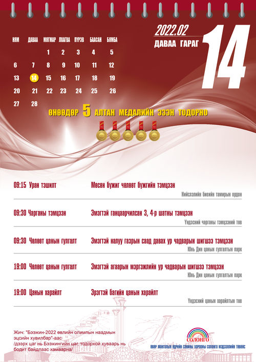 Бээжингийн өвлийн олимпын алтан медалийн тэмцээний цагийн хуваарь /02-р сарын 14-ний өдөр/