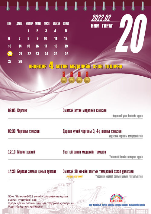 Бээжингийн Өвлийн олимпын алтан медалийн тэмцээний цагийн хуваарь /02-р сарын 20-ны өдөр/