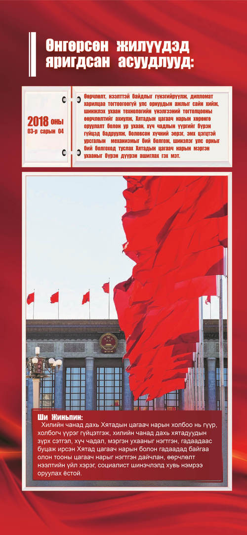 2022 оны бүх улсын ”Хоёр чуулган” болж байна. Энэ жил Хятадын Коммунист Намын XVIII их хурлаас хойш дарга Ши Жиньпин арав дахь удаагаа Бүх Хятадын Ардын Төлөөлөгчдийн Их хуралд оролцлоо.