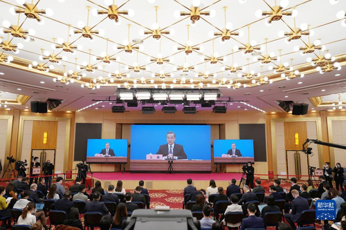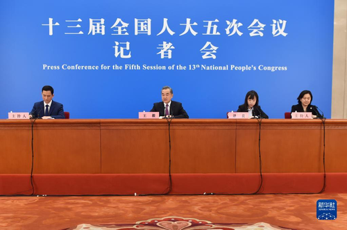 XIII сонгуулийн БХАТИХ-ын V чуулган03-р сарын 07-ндБээжингийн АИХ-ын ордонд видео хэвлэлийн бага хурал хийж, Төрийн зөвлөлийн гишүүн бөгөөд ГХ-ны сайд Ван И Хятадын гадаад бодлого, гадаад харилцааны талаар дотоод, гадаадын сэтгүүлчдийнасуултад хариулав Зургийг: ЧЭНЬ ЖҮНХАО