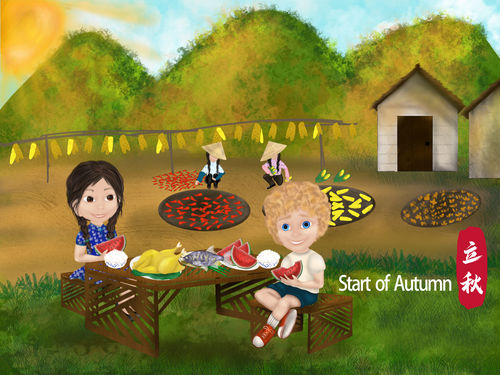 Сарны зурхайн ёсны жилийн 24 улирлын 13 дахь улирал болох “Намрын урь” нь энэ жил 08 дугаар сарын 07-ны өдөр тохиолоо. Намрын урь нь зун дуусаж, намар эхэлж буйг илэрхийлдэг. Хятадын зарим бүс нутагт энэ үеэр тарвас идэхийг “намрыг мэрэх” хэмээн өвөрмөцөөр нэрлэдэг байна. Бас нэгэн уламжлалт зан үйл байдаг нь хүмүүс халуун зунаар турж, намар орохоор “жин нэмэх” явдал болно. Тиймээс би хятад охин болон гадаад хөвгүүн гартаа тарвас барьж, тахианы мах, шарсан загас, цагаан будаа идэхээр бэлдэж байгаа зураг зурсан. Тэдний ард таримлын бүтээгдэхүүн дэлгэн суух тариаланчид, зураг мэт намрын үзэмж нийлээд үр тарианы элбэг уналтыг бэлгэдэж байна.