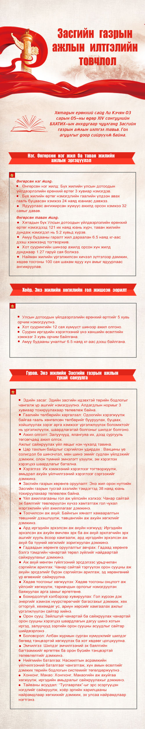 Хятадын ерөнхий сайд Ли Кэчян 03 сарын 05-ны өдөр XIV сонгуулийн БХАТИХ-ын анхдугаар чуулганд Засгийн газрын ажлын илтгэл тавьв. Гол агуулгыг доор сийрүүлж байна.
